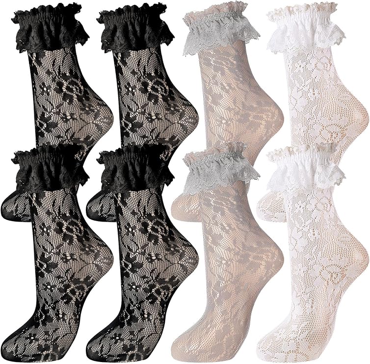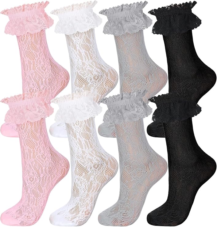 4 Pairs Women's Lace Ankle Socks Ruffle Frilly Socks Mesh Cute Dress Socks for Women Ladies Princess Accessories
