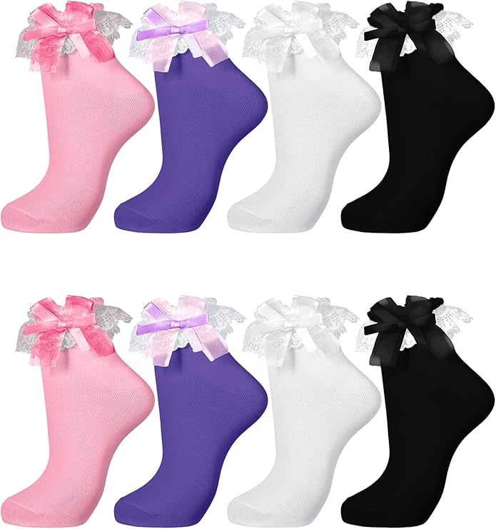 4 Pairs Women's Ruffle Socks Lace Ankle Socks Frilly White Socks Women Cute Cotton Socks with Bow