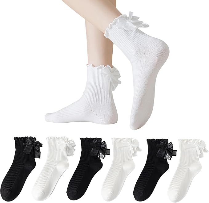 Women's Ruffle Socks,Casual Bow Tie Cute Ankle Socks Warm Knit Cotton Frilly White Socks for Women 6 Pack